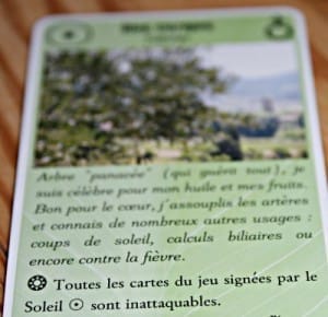 Exemple 1 : la carte 11, l’olivier, une fois posée dans le Jardin d’un joueur rend inattaquables toutes les cartes du jeu signées par le Soleil. Tous les joueurs voient ainsi leurs cartes Soleil protégées des attaques.