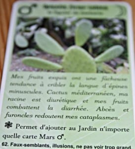 Exemple 2 : la carte 62, le figuier de barbarie, permet d’ajouter au Jardin n’importe quelle carte Mars. Là encore, seul le joueur qui possède cette carte dans son Jardin peut utiliser cette capacité.