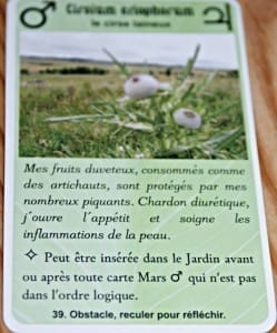 Exemple 1 : la carte 39, le cirse laineux, peut être insérée dans le Jardin avant ou après toute carte Mars qui n’est pas l’ordre logique. Cela signifie que si une carte Mars est déjà dans le Jardin sans qu’elle respecte l’ordre des symboles planétaires, la carte 39 peut être posée avant ou après cette carte Mars. NB : il n’est pas possible de poser une carte à gauche de l’Ouverture.