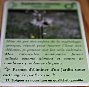 Exemple 2 : la carte no 27, l’asphodèle, permet à un joueur la possédant déjà dans son Jardin d’éliminer de n’importe quel Jardin une carte signée par Saturne. Celle-ci est alors mise dans le Passé. Le joueur qui utilise cette capacité ne pioche pas avant et ne pose aucune carte après l’utilisation de cette capacité.